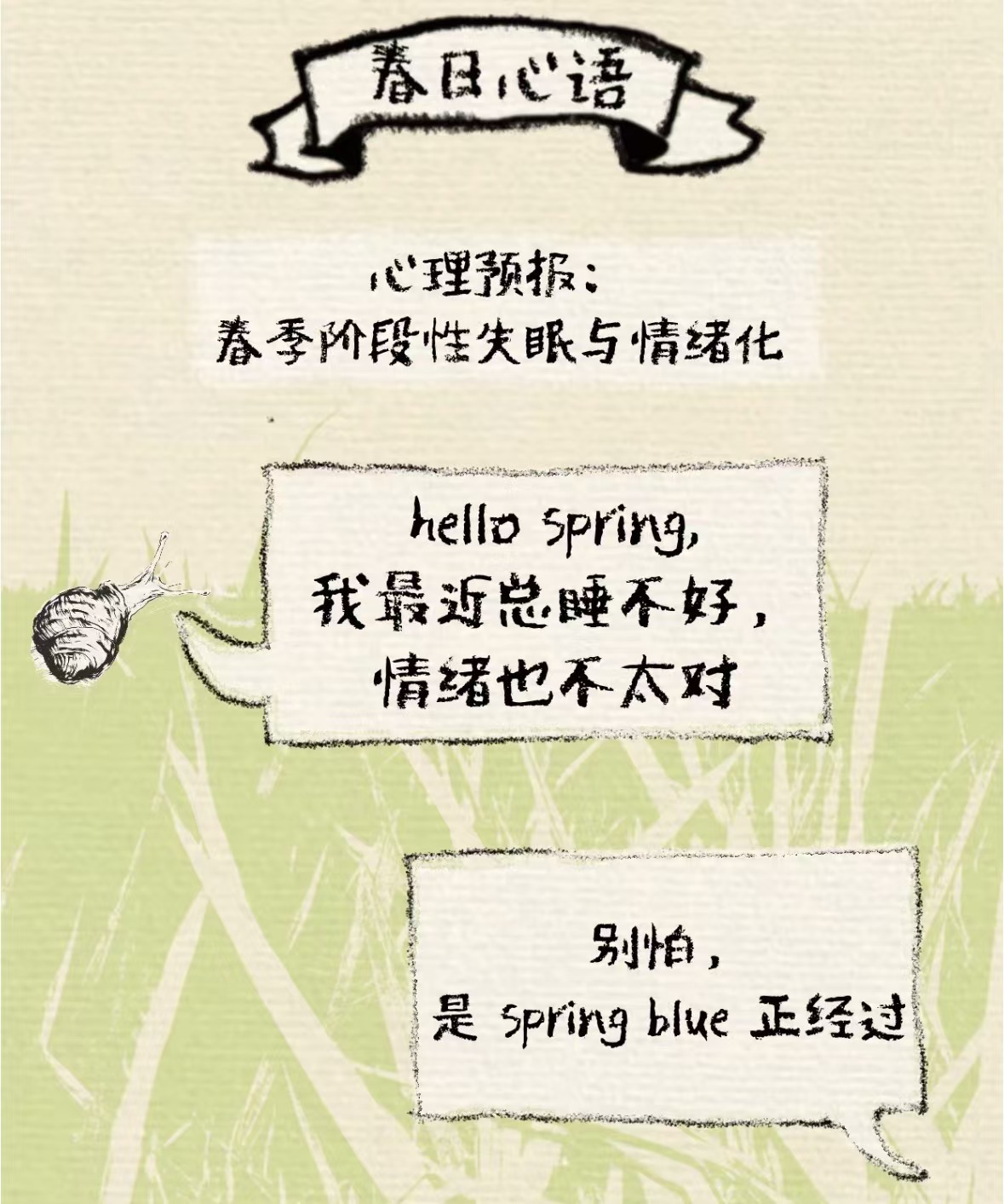 春季气温逐渐回升,天气多变,人体内分泌系统容易发生变化,进而情绪容易发生波动。此外,春季昼夜时长变化较大,生物钟紊乱,容易导致睡眠质量下降,增加心理疾病的发生风险。同时,寒假刚刚结束,新学期刚刚开学,同学们正在逐步适应公司的学习生活节奏,难免身心不适,容易引发焦虑、抑郁等情绪问题。