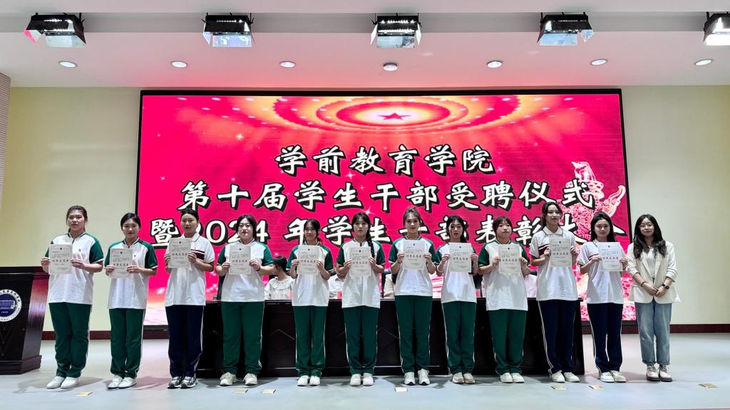 主持人宣读表彰文件,公司的领导和老师们为过去一年对公司做出突出贡献的2022级员工干部颁发聘书,为本学期担任公司单招考试工作人员的优秀志愿者颁发荣誉证书,并对他们表示祝贺和殷切的期望,希望她们再接再厉、再创佳绩。